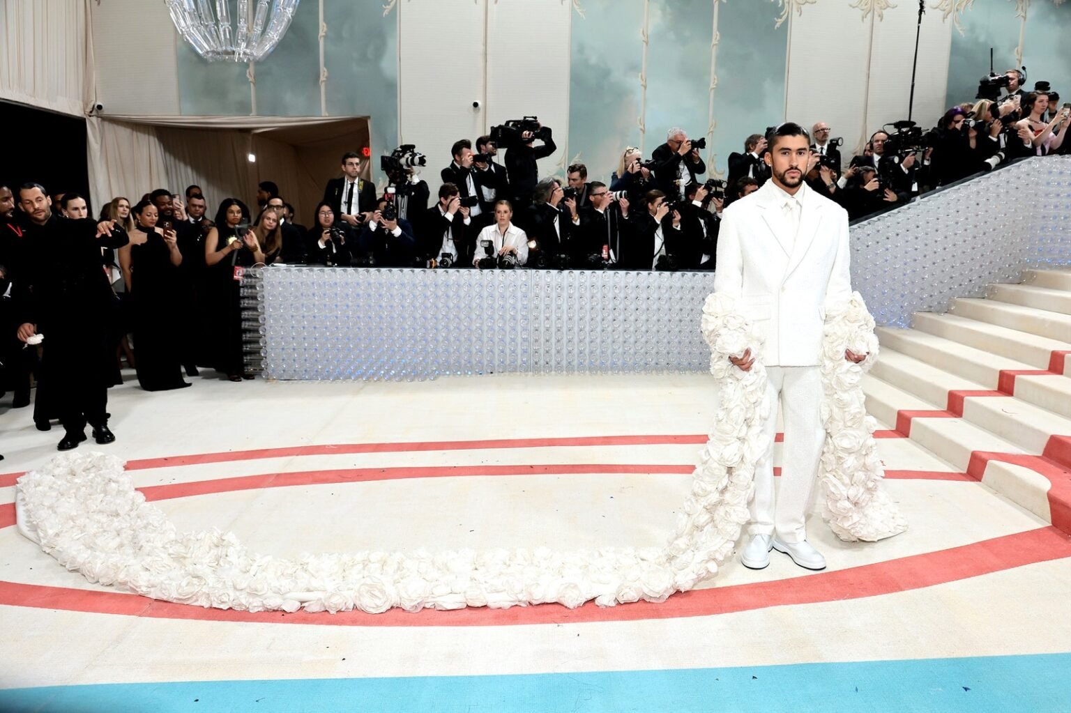 El look de traje blanco y corbata se elevó gracias a su espalda abierta y una capa con un largo tren floral. El superastro de “Tití Me Preguntó” completó el atuendo con un peinado recogido. El año pasado, el cantante hizo su debut en el Met Gala cuando optó por un mono personalizado de Burberry, completo con clips de pelo floral dorados. No es de extrañar que Bunny haya usado Jacquemus para la prestigiosa evento en 2023, ya que tiene una historia con la marca como la cara de su campaña de primavera en 2022.