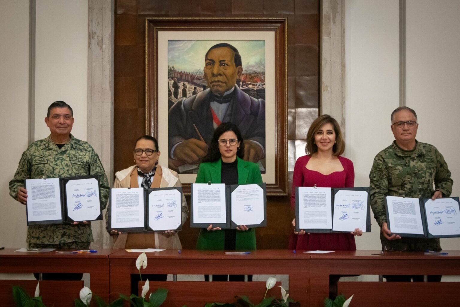 Los firmantes de los documentos fueron Luisa María Alcalde Luján, titular de la Secretaría de Gobernación; Rosa Icela Rodríguez, de la Secretaría de Seguridad y Protección Ciudadana; el general Luis Cresencio Sandoval, de la Secretaría de la Defensa Nacional; y Juan José Padilla Olmos en representación del almirante José Rafael Ojeda Durán, de la Secretaría de Marina. El convenio fue firmado con la presidenta del Colegio Nacional del Notariado Mexicano, Guadalupe Díaz Carranza.