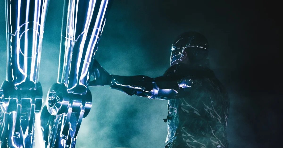 El escenario se ilumina con poderosos láseres de colores y la atención se centra en una estatua de un androide gigante en el escenario secundario. Esta pieza, creada por el famoso artista japonés Hajime Sorayama, conocido por sus ilustraciones de robots femeninos, encaja perfectamente con el concepto del espectáculo de The Weeknd.