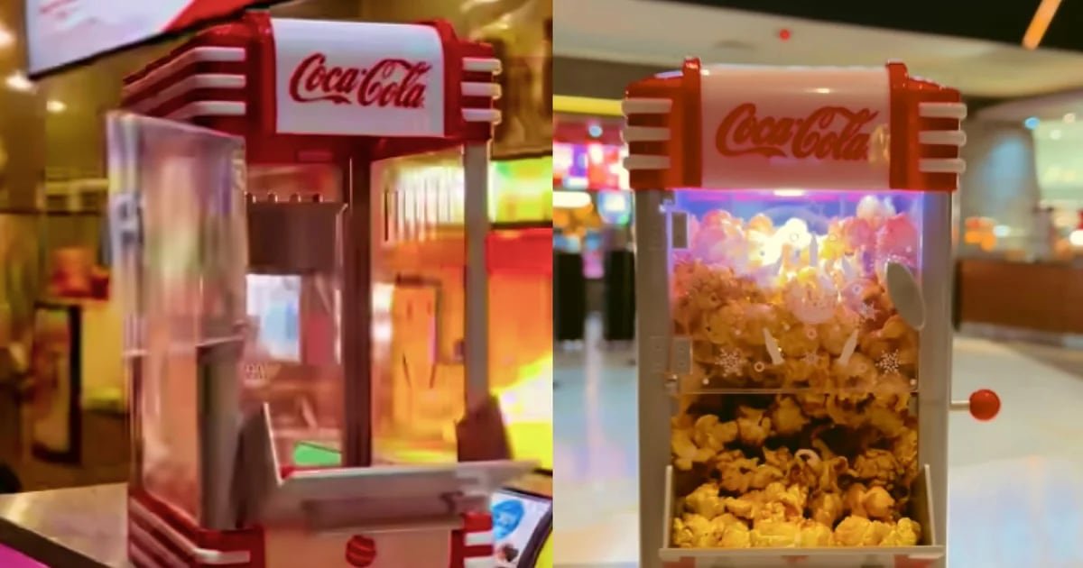 La “Palomera Coca Cola” de Cinemex, diseñada al estilo de las clásicas máquinas de palomitas, promete transportar a los cinéfilos a la época dorada de las salas de proyección. Equipada con una tapa de movimiento manual en la parte superior y una compuerta de cristal en la frontal, esta palomera ofrece la autenticidad de una máquina de palomitas de cine en una versión compacta.