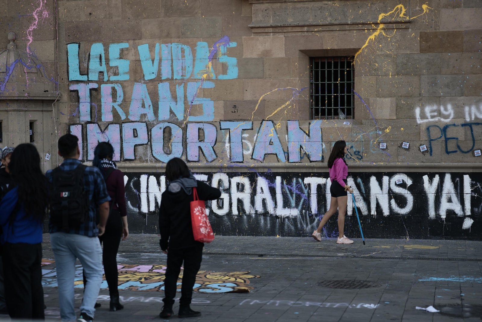 Las manifestantes, en su mayoría mujeres trans, pintaron consignas en el muro del recinto, como “las vidas trans importan”, “México transfóbico” y “Ley integral trans”. Mediante un altavoz, una de las voceras expresó su indignación y cuestionó hasta cuándo se detendrán los asesinatos y los crímenes contra las personas trans.