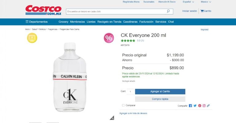 Calvin Klein Everyone es una fragancia unisex que destaca por su frescura y modernidad. Con notas de naranja y jengibre, es perfecta para hombres que buscan un aroma ligero y versátil. A pesar de su precio regular de mil 200 pesos, actualmente lo puedes encontrar en Costco por solo $899. ¡Aprovecha esta oportunidad!