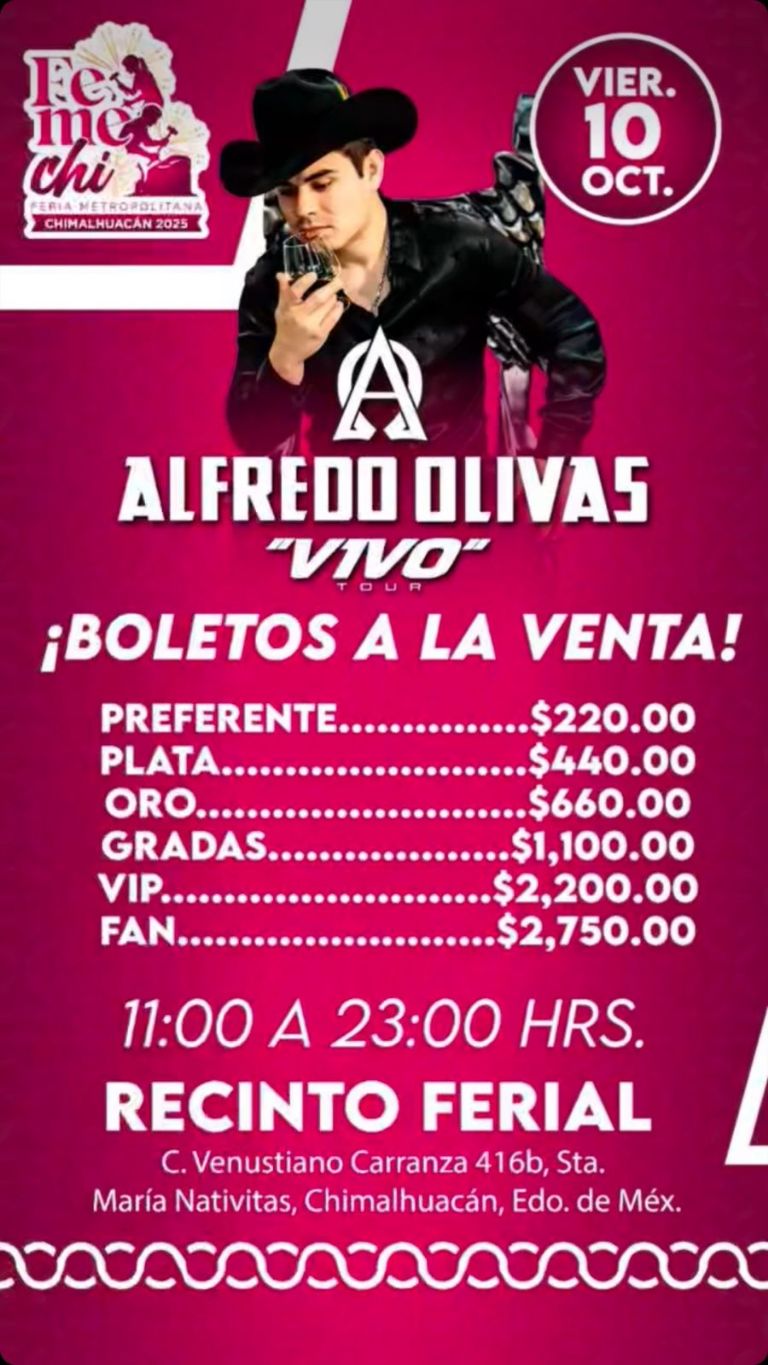 Este viernes 10 de octubre, la Feria Metropolitana Chimalhuacán 2025 (FEMECHI 2025) se viste de gala con el concierto de Alfredo Olivas, el cual promete emocionar a miles de asistentes. Desde su arranque el pasado 1 de octubre, dicha fiesta se ha convertido en uno de los festejos más ovacionados del Estado de México, gracias a sus artistas invitados y una producción que combina tradición, cultura y entretenimiento.