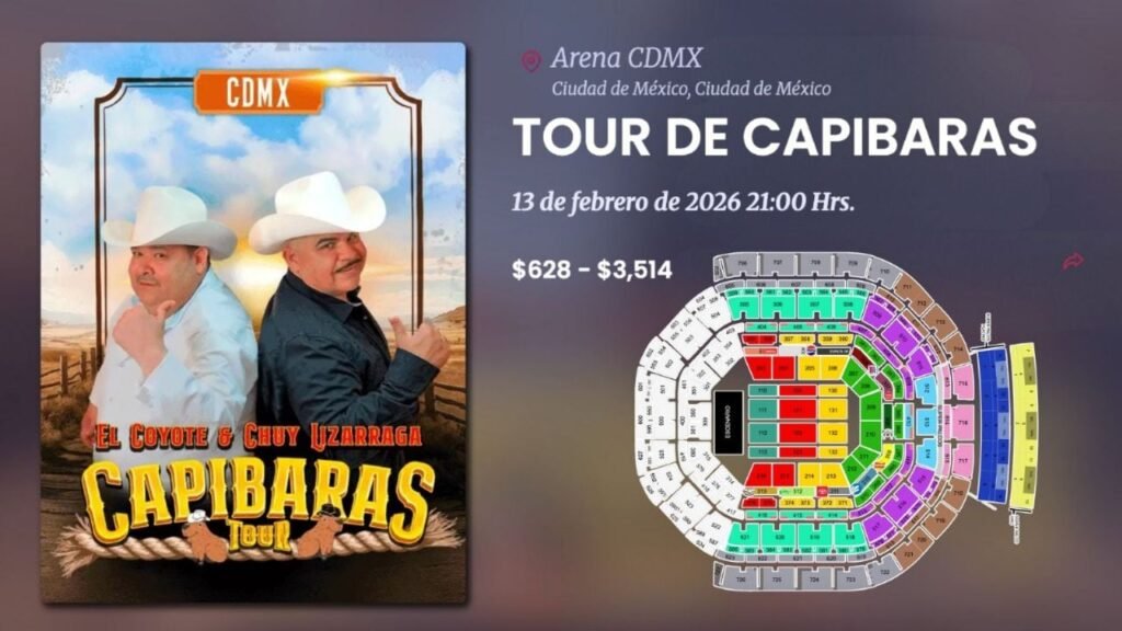 La Arena Ciudad de México se prepara para recibir uno de los conciertos más esperados del regional mexicano: Capibaras Tour 2026, una gira histórica protagonizada por Chuy Lizárraga y El Coyote y su Banda Tierra Santa. Dos leyendas del género se unen en un mismo escenario para ofrecer un espectáculo sin precedentes, con duetos exclusivos, un montaje de primer nivel y un recorrido por los grandes éxitos que han marcado generaciones. Si eres fan del regional mexicano, esta es la oportunidad perfecta para vivir un concierto inolvidable, y aquí te contamos cuándo será, cuánto cuestan los boletos y qué zonas estarán disponibles.