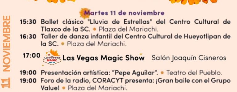 - 15:30 h – Ballet clásico “Lluvia de Estrellas” del Centro Cultural de Tlaxco de la SC en la Plaza del Mariachi